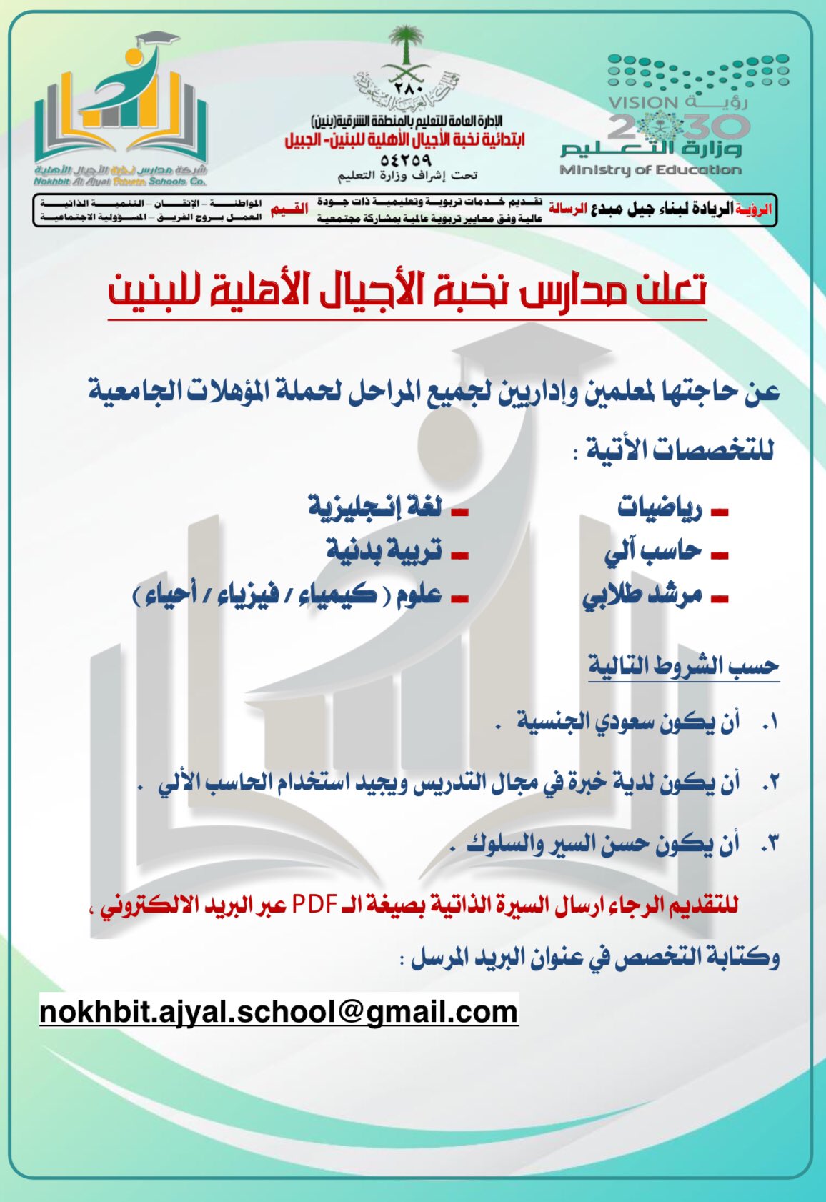 مدارس نخبة الأجيال الأهليةأعلنت مدارس نخبة الأجيال الأهلية (بنين) بالجبيل توفر وظائف تعليمية وإدارية في مختلف التخصصات، وذلك وفقاً للتفاصيل والشروط وطريقة التقديم الموضحة أدناه.